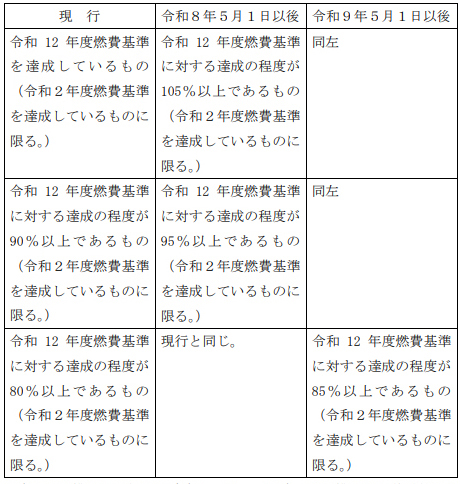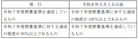 自動車重量税を免除し、又は税率を50%軽減する自動車に係る燃費性能に関する要件を次のとおりとする。